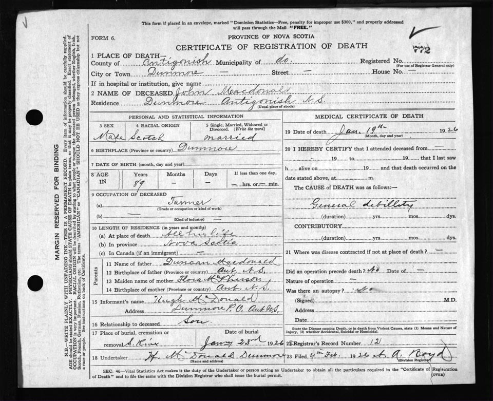 Male Death Registration: Year: 1926 file: 55 number: 772