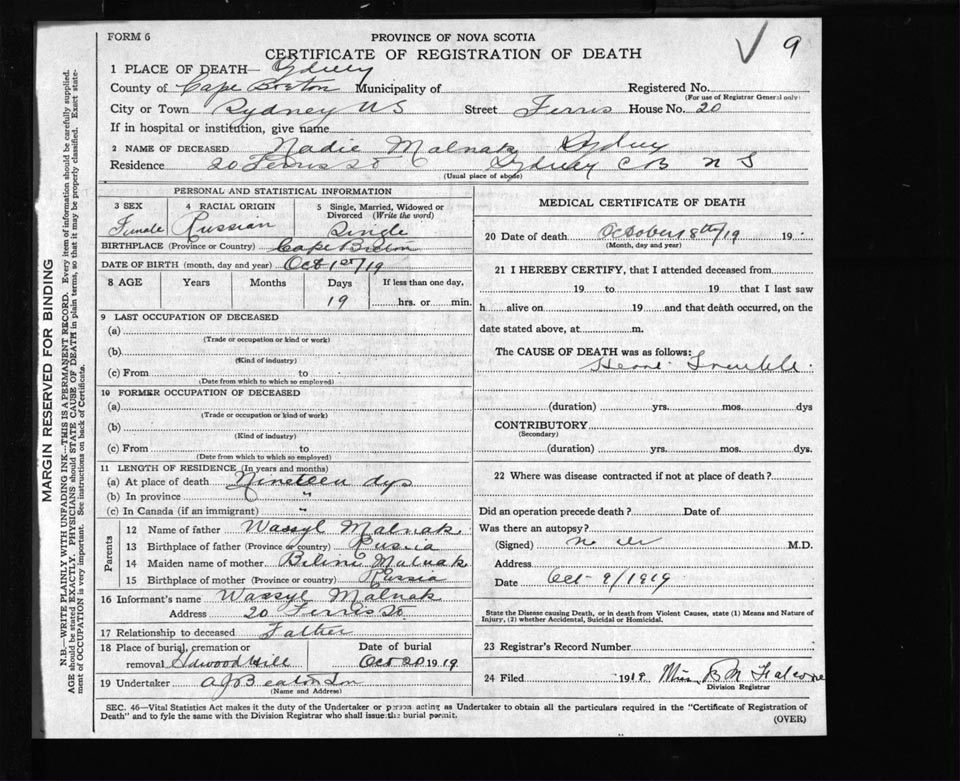 Death Registration: Year: 1919 file: 56 number: 9