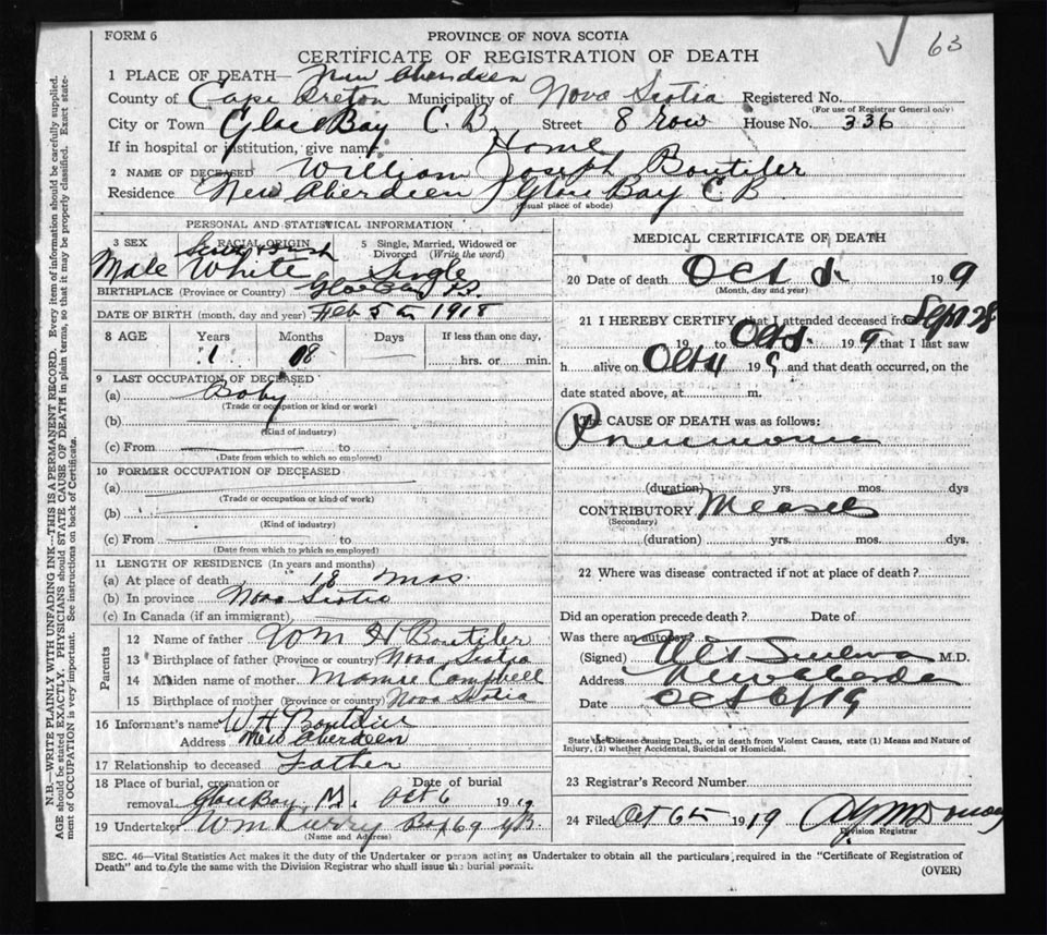 Death Registration: Year: 1919 file: 56 number: 63