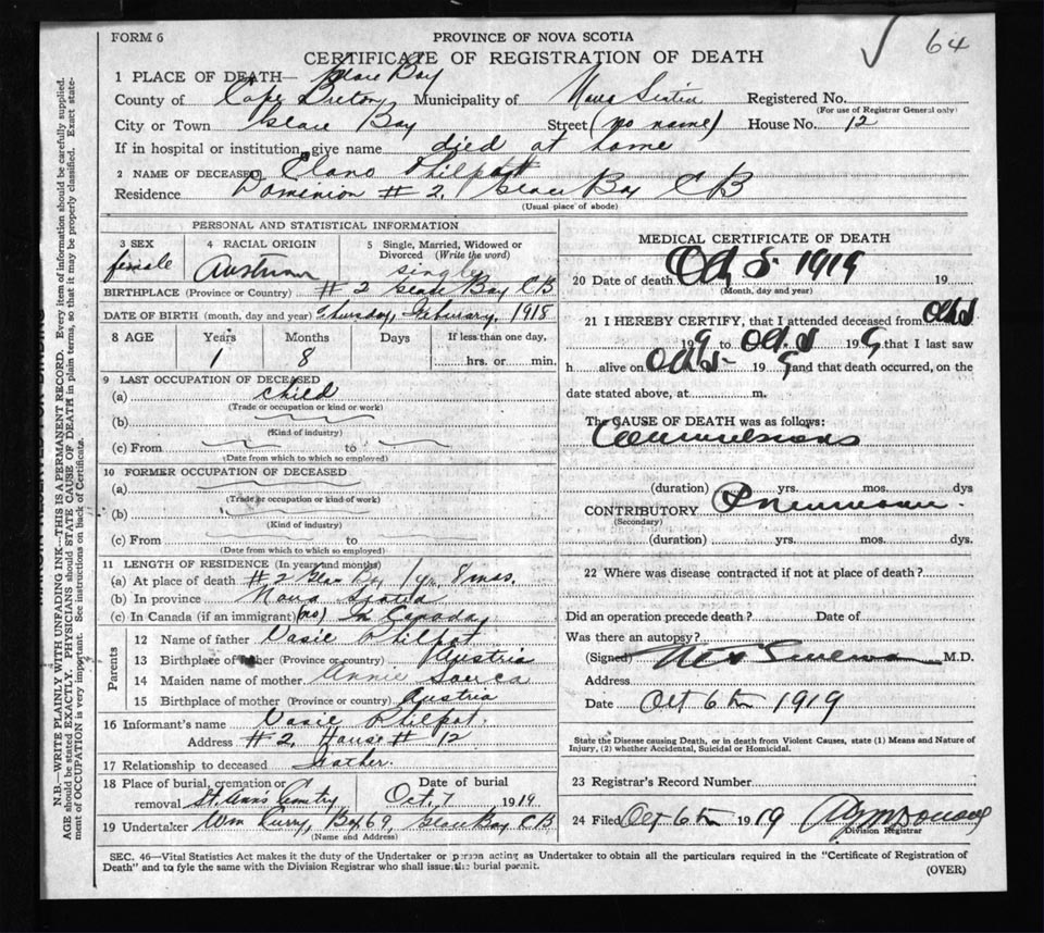 Death Registration: Year: 1919 file: 56 number: 64