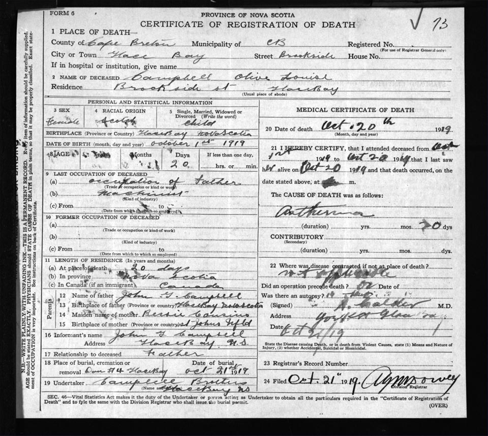 Death Registration: Year: 1919 file: 56 number: 73