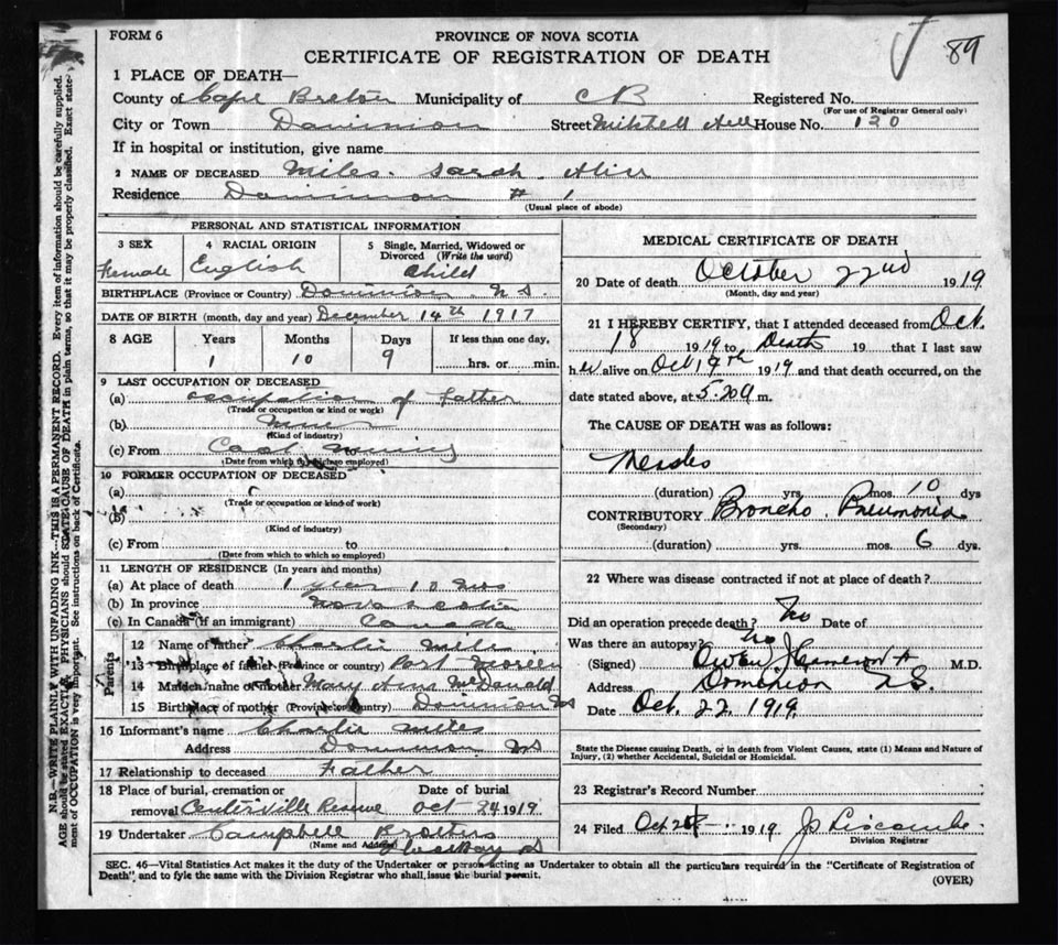 Death Registration: Year: 1919 file: 56 number: 89