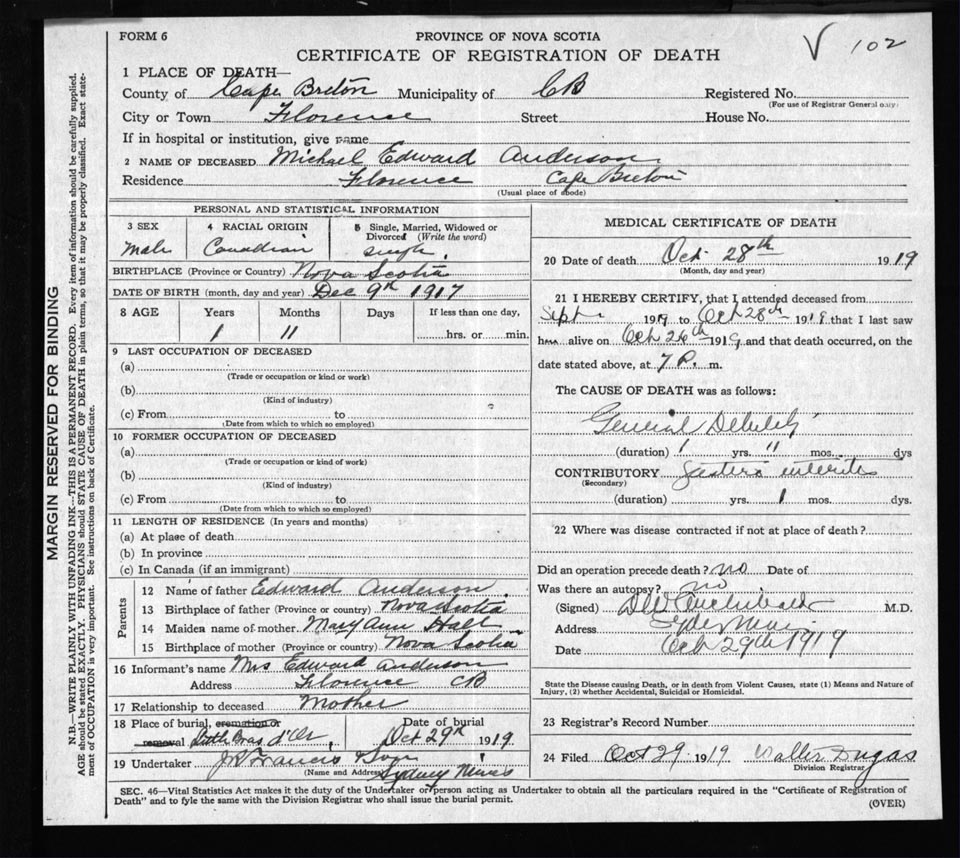 Death Registration: Year: 1919 file: 56 number: 102