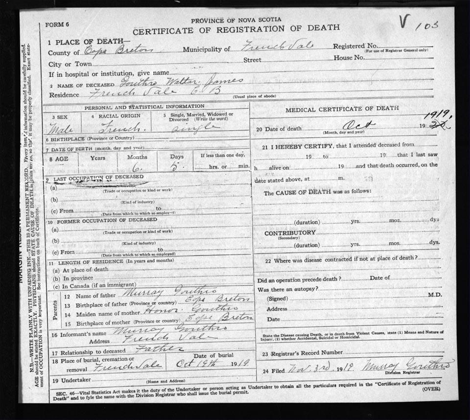 Death Registration: Year: 1919 file: 56 number: 103