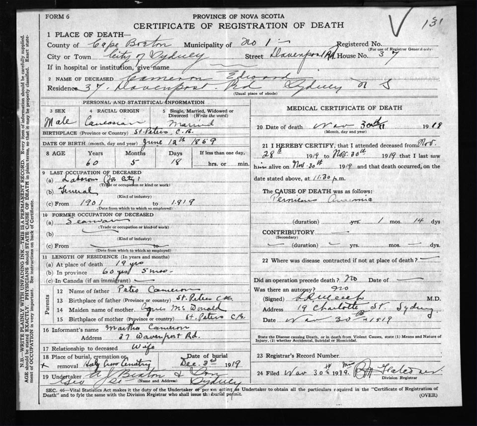 Death Registration: Year: 1919 file: 56 number: 131
