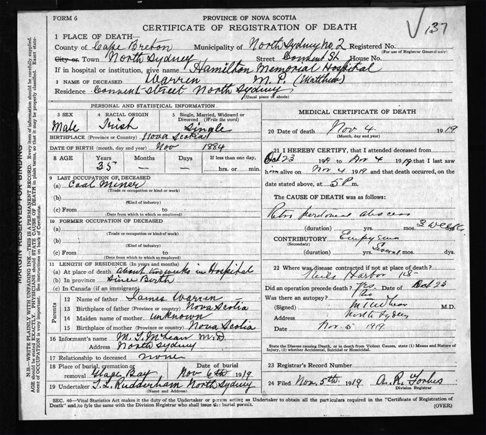 Male Death Registration: Year: 1919 file: 56 number: 137