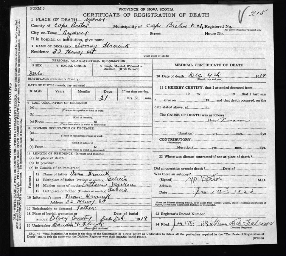 Male Death Registration: Year: 1919 file: 56 number: 215