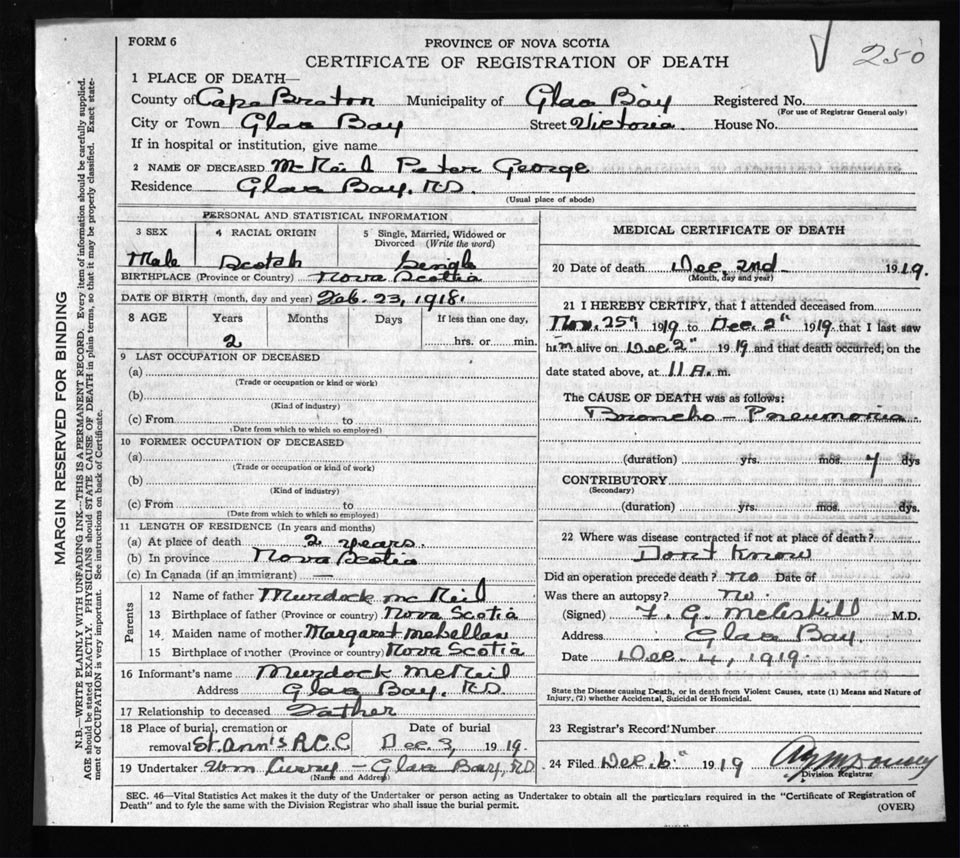 Male Death Registration: Year: 1919 file: 56 number: 250