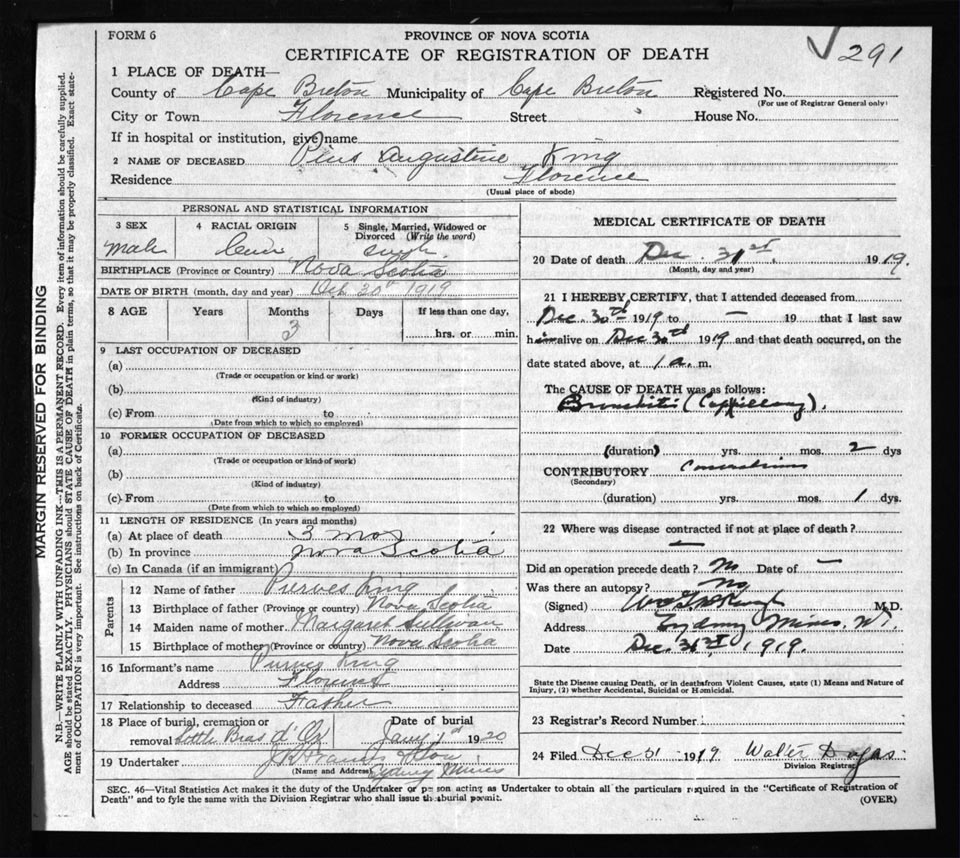 Male Death Registration: Year: 1919 file: 56 number: 291