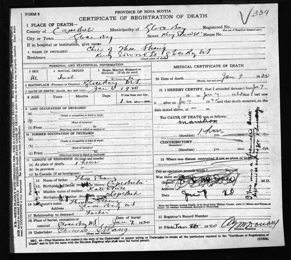 Male Death Registration: Year: 1920 file: 56 number: 339