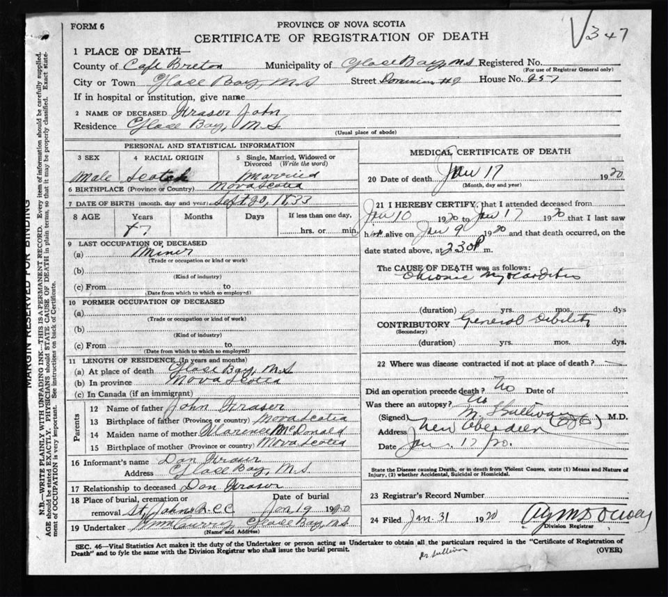 Male Death Registration: Year: 1920 file: 56 number: 347