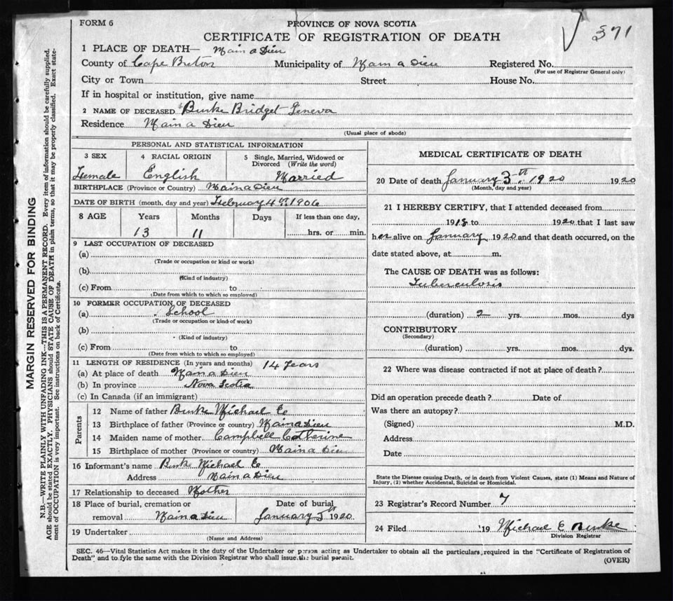Female Death Registration: Year: 1920 file: 56 number: 371