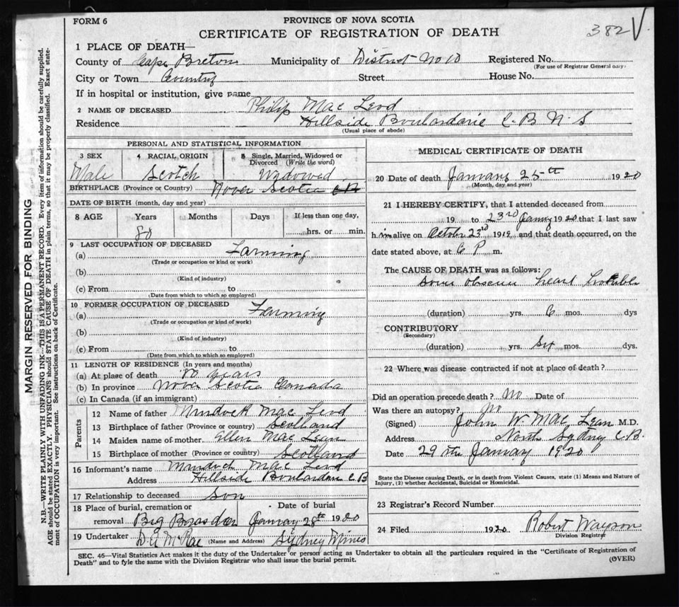 Male Death Registration: Year: 1920 file: 56 number: 382