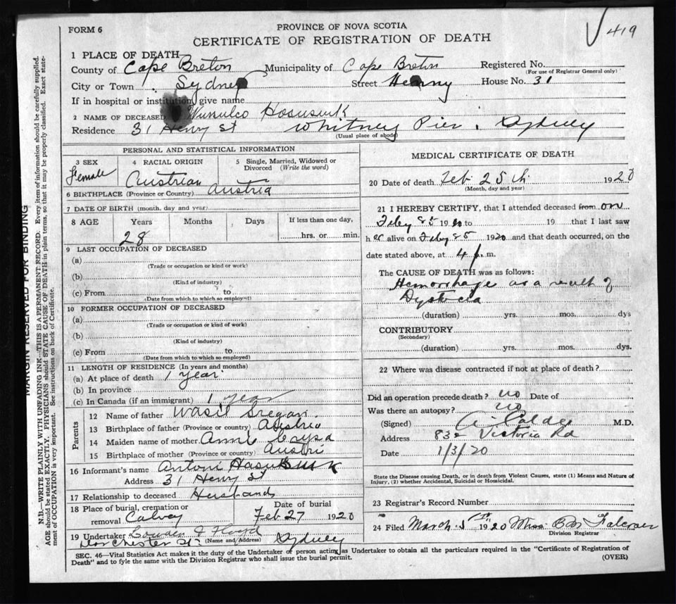 Female Death Registration: Year: 1920 file: 56 number: 419