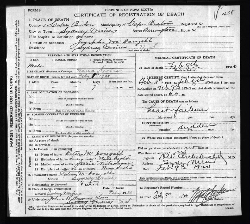 Male Death Registration: Year: 1920 file: 56 number: 438