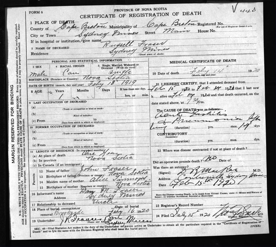 Male Death Registration: Year: 1920 file: 56 number: 443
