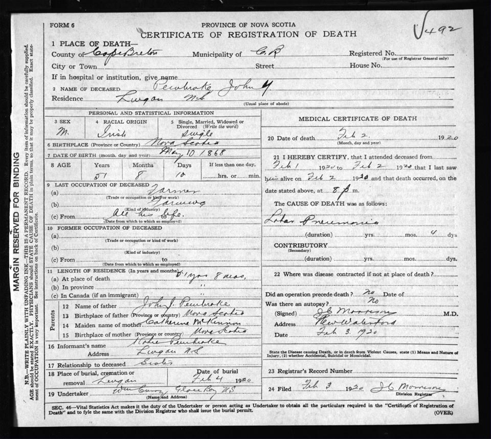 Male Death Registration: Year: 1920 file: 56 number: 492