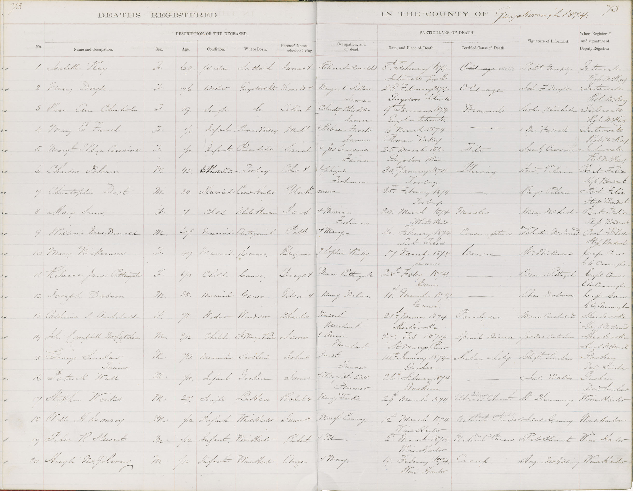 Death Registration: Year: 1874 book: 1807 page: 73 number: 20