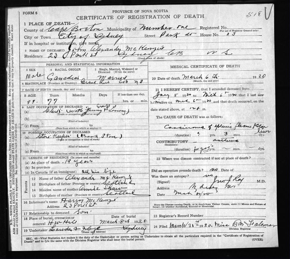 Male Death Registration: Year: 1920 file: 56 number: 518