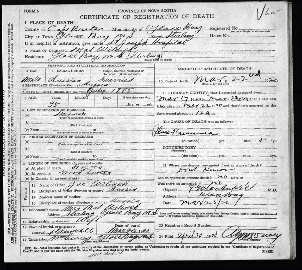 Male Death Registration: Year: 1920 file: 56 number: 605