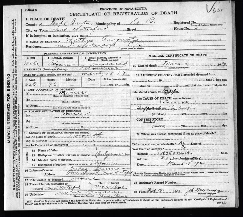 Male Death Registration: Year: 1920 file: 56 number: 631