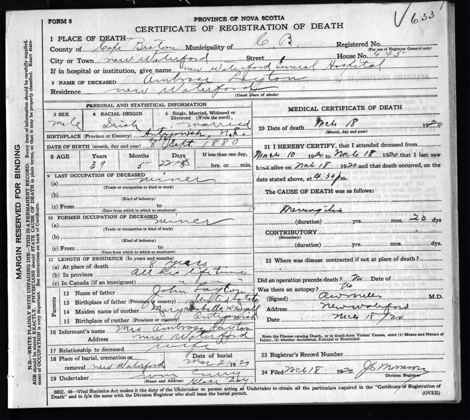 Male Death Registration: Year: 1920 file: 56 number: 633