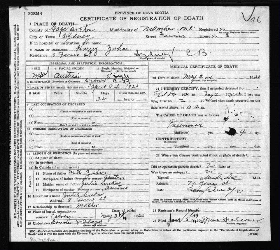 Male Death Registration: Year: 1920 file: 57 number: 96