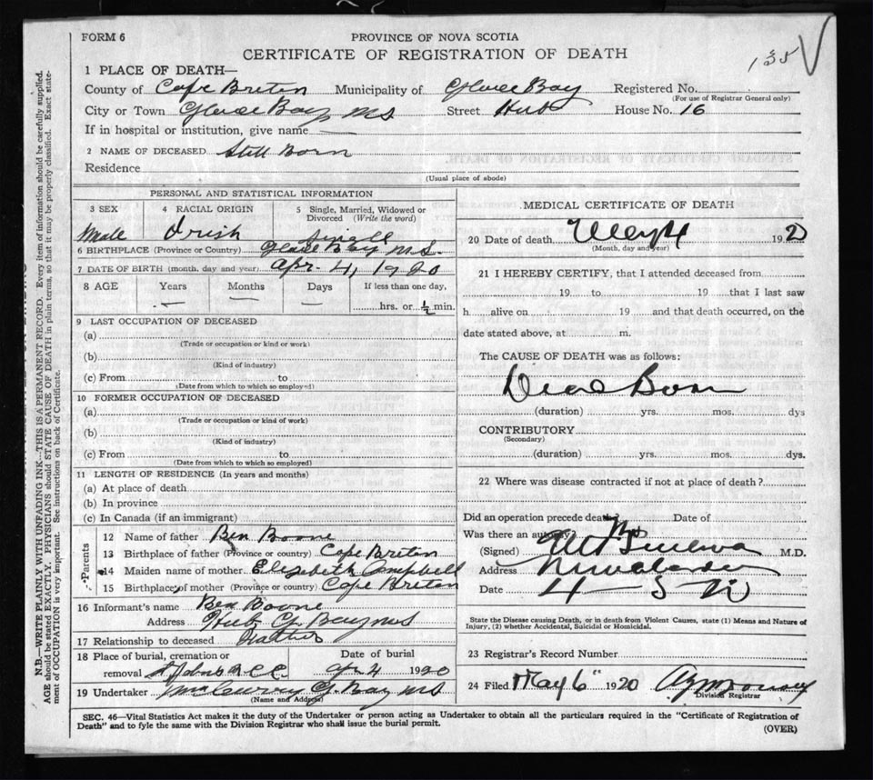 Male Death Registration: Year: 1920 file: 57 number: 135