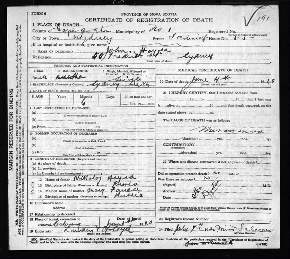 Male Death Registration: Year: 1920 file: 57 number: 191