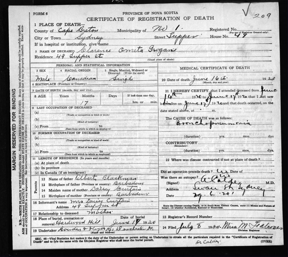Male Death Registration: Year: 1920 file: 57 number: 209