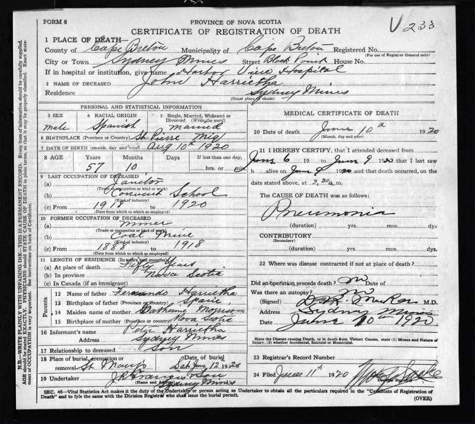 Male Death Registration: Year: 1920 file: 57 number: 233