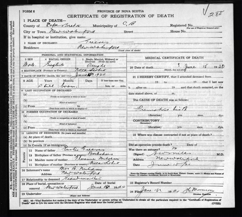 Male Death Registration: Year: 1920 file: 57 number: 285