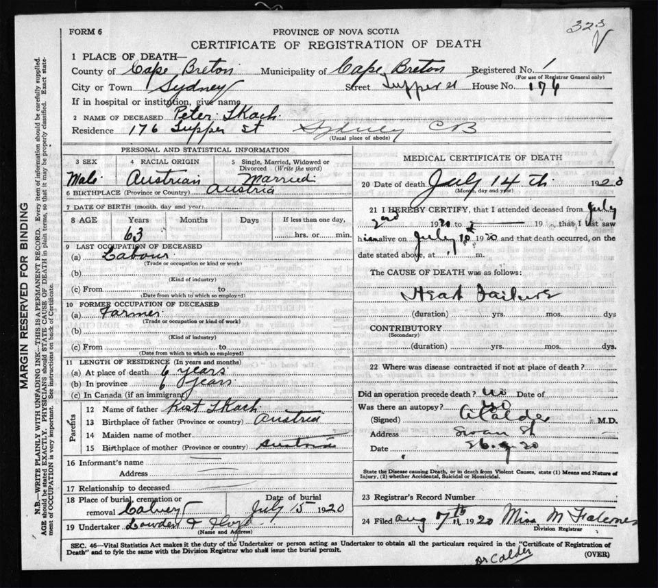 Male Death Registration: Year: 1920 file: 57 number: 323