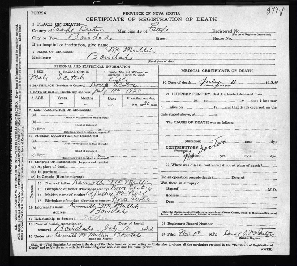 Male Death Registration: Year: 1920 file: 57 number: 399