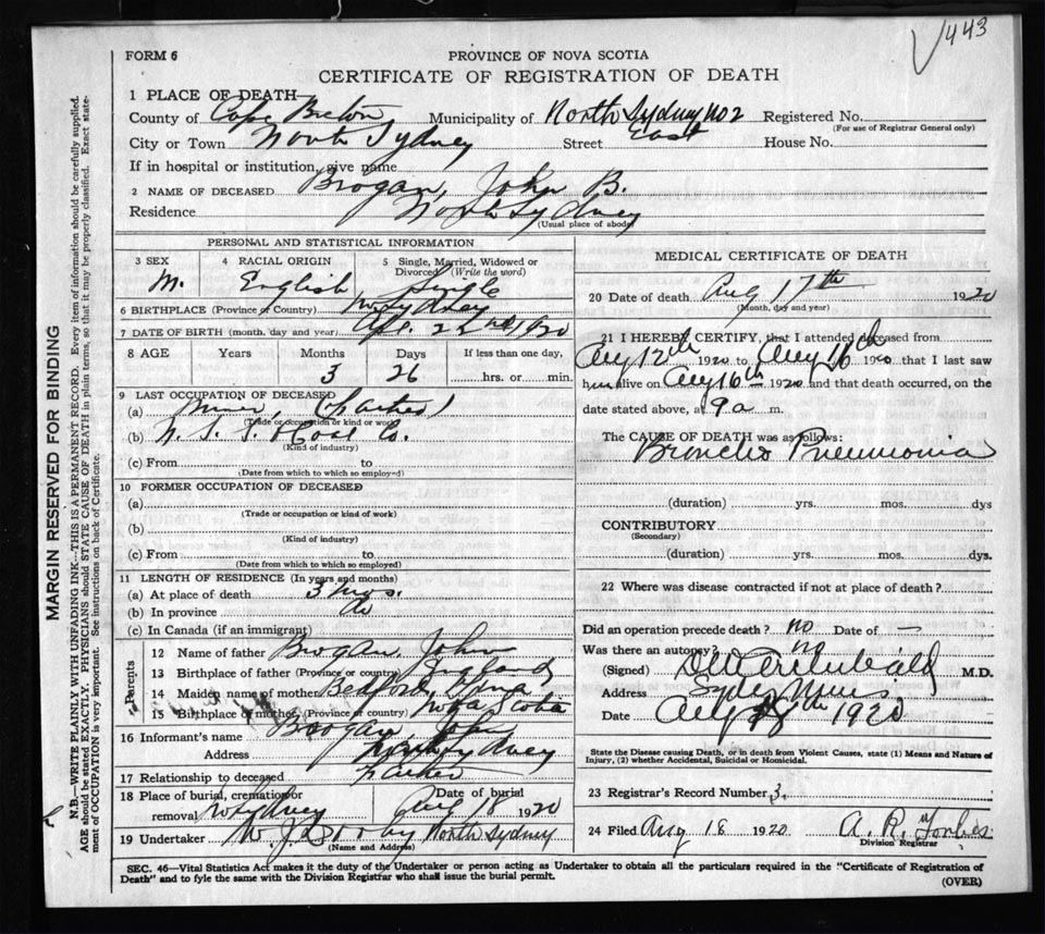 Male Death Registration: Year: 1920 file: 57 number: 443