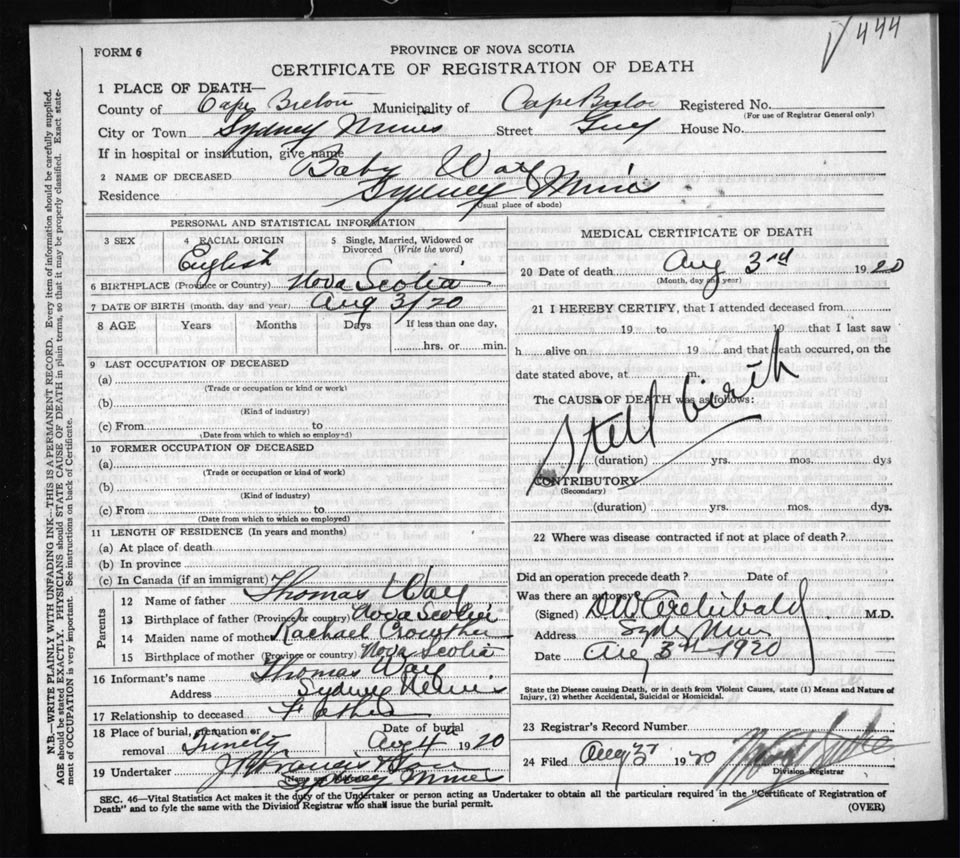 Death Registration: Year: 1920 file: 57 number: 444