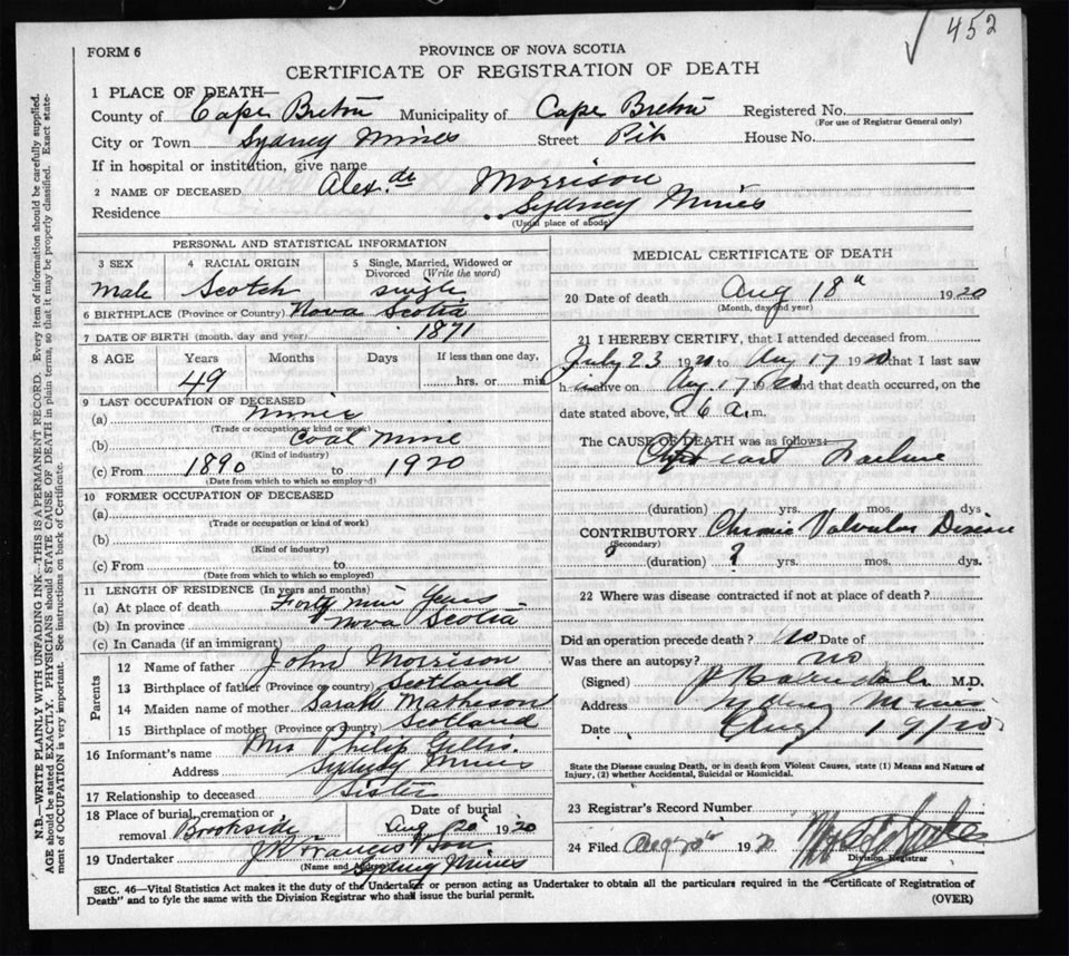 Male Death Registration: Year: 1920 file: 57 number: 452