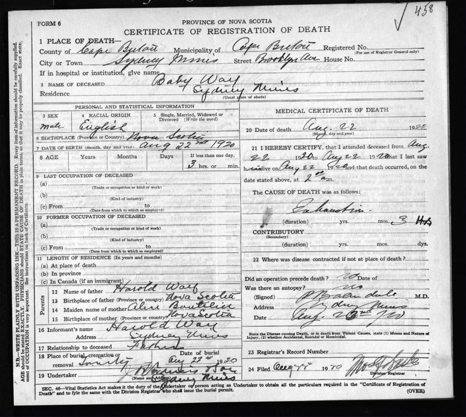 Male Death Registration: Year: 1920 file: 57 number: 458