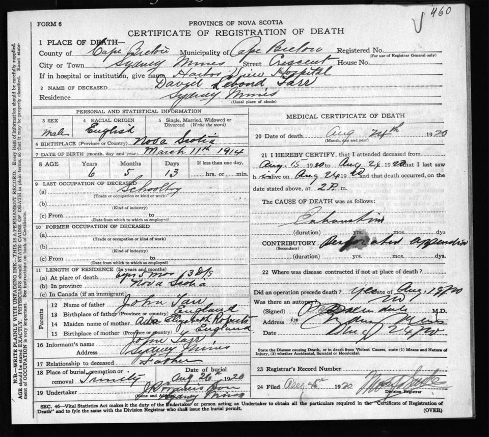 Male Death Registration: Year: 1920 file: 57 number: 460