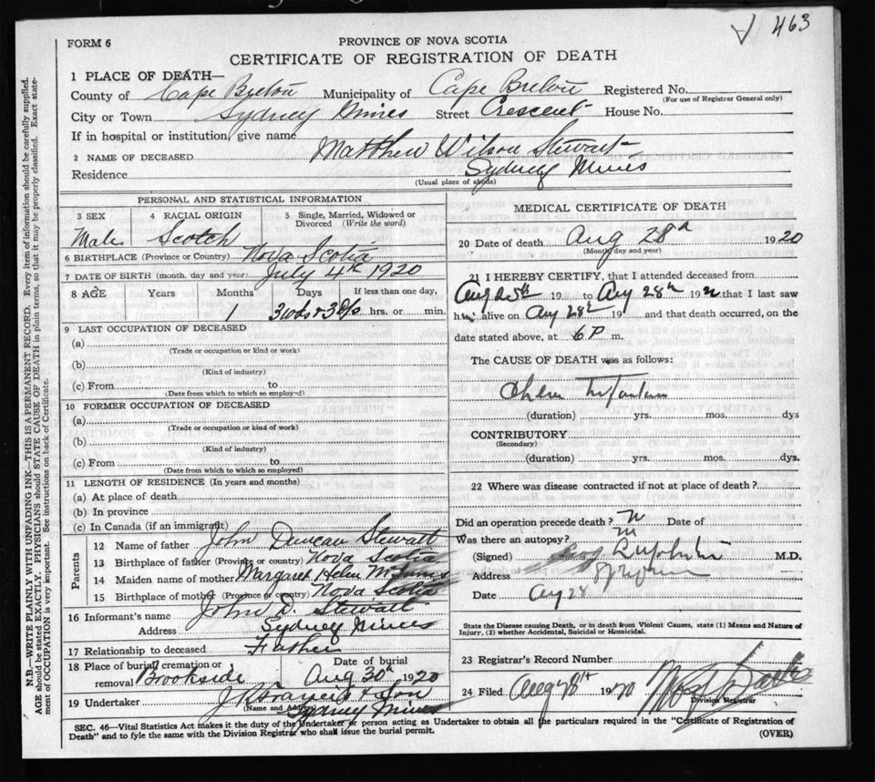 Male Death Registration: Year: 1920 file: 57 number: 463