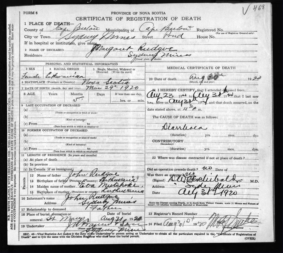 Female Death Registration: Year: 1920 file: 57 number: 468