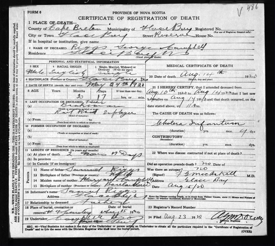 Male Death Registration: Year: 1920 file: 57 number: 486