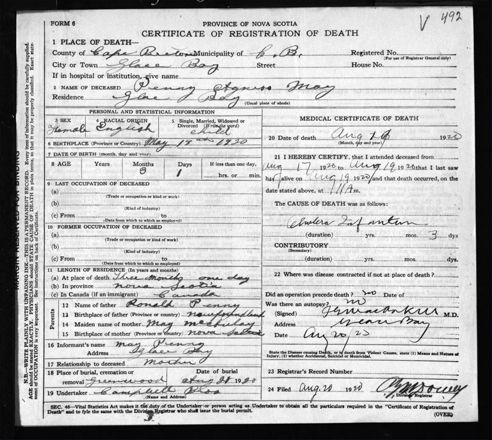 Female Death Registration: Year: 1920 file: 57 number: 492