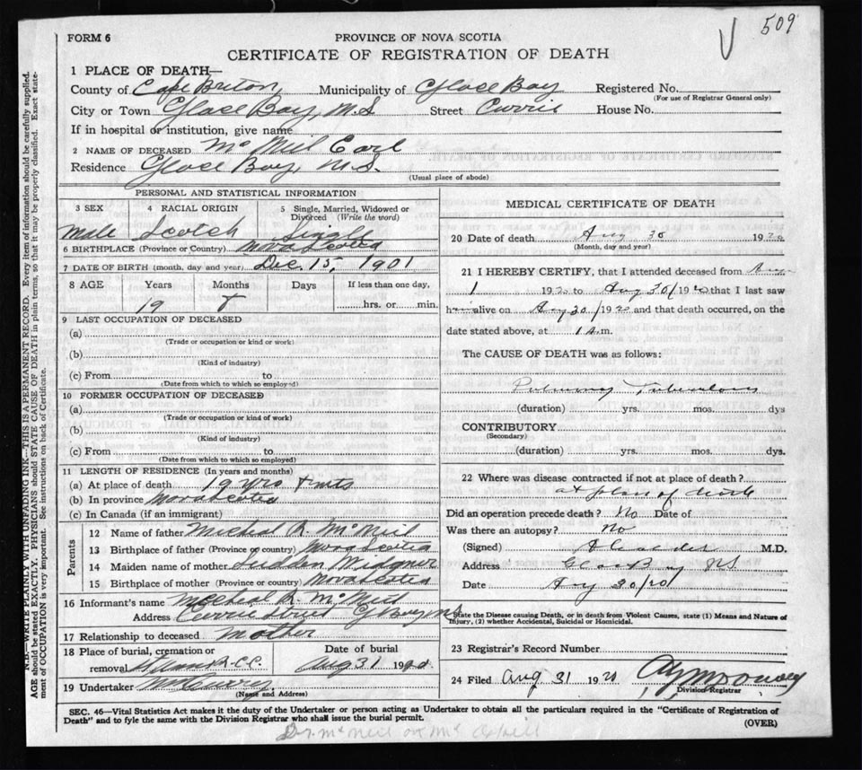 Male Death Registration: Year: 1920 file: 57 number: 509