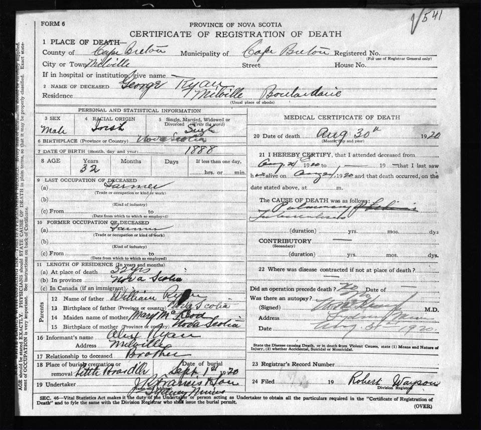 Male Death Registration: Year: 1920 file: 57 number: 541