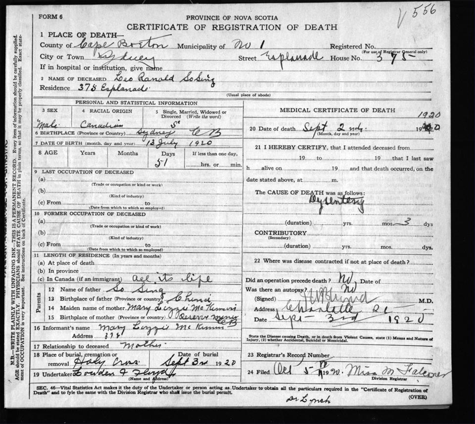Male Death Registration: Year: 1920 file: 57 number: 556