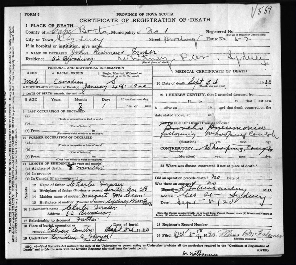 Male Death Registration: Year: 1920 file: 57 number: 559