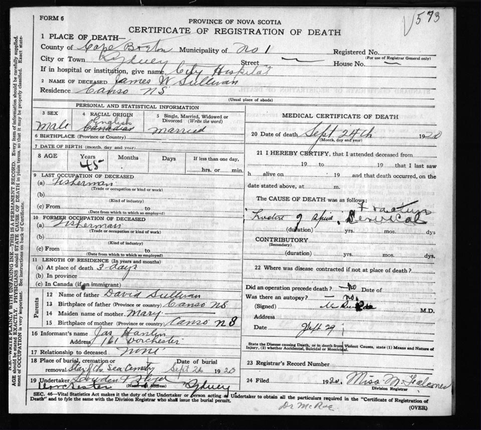 Male Death Registration: Year: 1920 file: 57 number: 573