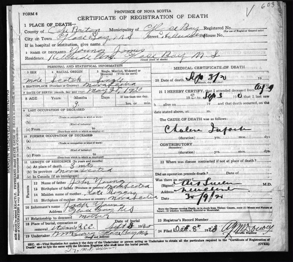 Male Death Registration: Year: 1920 file: 57 number: 603