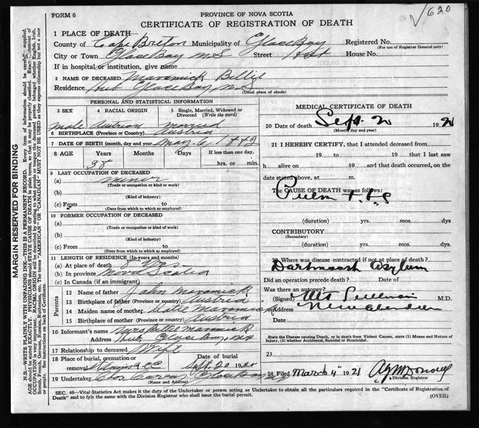 Male Death Registration: Year: 1920 file: 57 number: 620